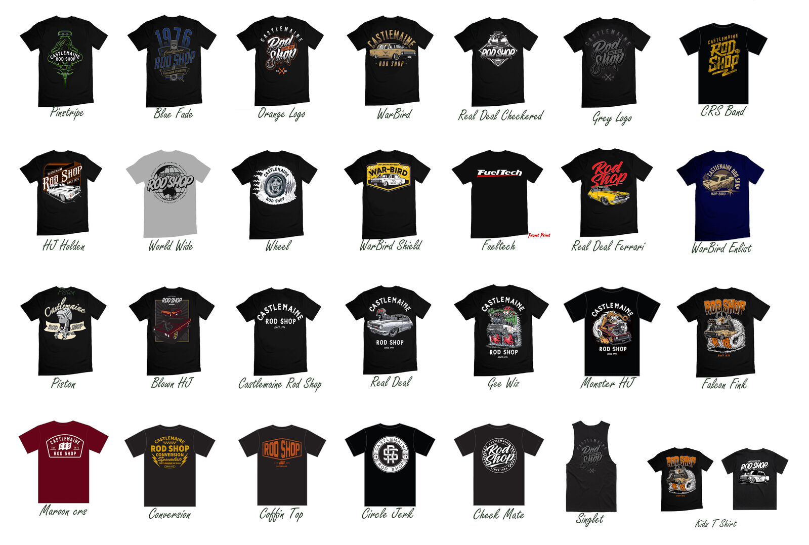 Blown HJ Blue Fade Piston Castlemaine Rod Shop Grey Logo HJ Holden Orange Logo Pinstripe Piston Real Deal Checkered Real Deal LC Singlet Grey Logo Fueltech Warbird Enlist Warbird Shield Warbird XP Warbird - Falcon Fink Wheel World Wide Gee Wiz Monster HJ Real Deal Ferrari CRS Band Maroon CRS Conversion Coffin Top Circle Jerk Check Mate KIDS Warbird KIDS Warbird Fink |